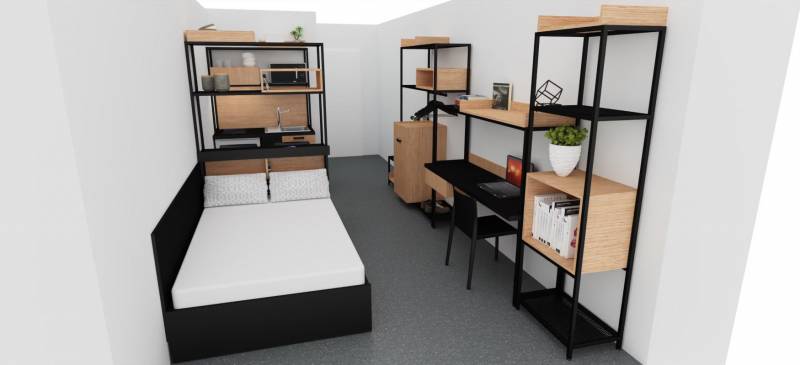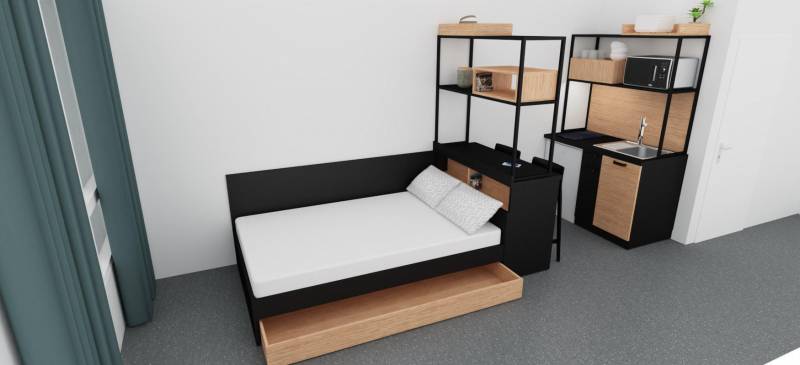 L'aménagement d'une chambre étudiante doit répondre à de nombreux besoins dans un espace restreint. Pour tous les projets de résidence étudiante, le travail de notre bureau d'études est primordial. A chaque nouvelle résidence, il est nécessaire de concevoir un mobilier adapté aux chambres et à leurs contraintes techniques ou d'usages.