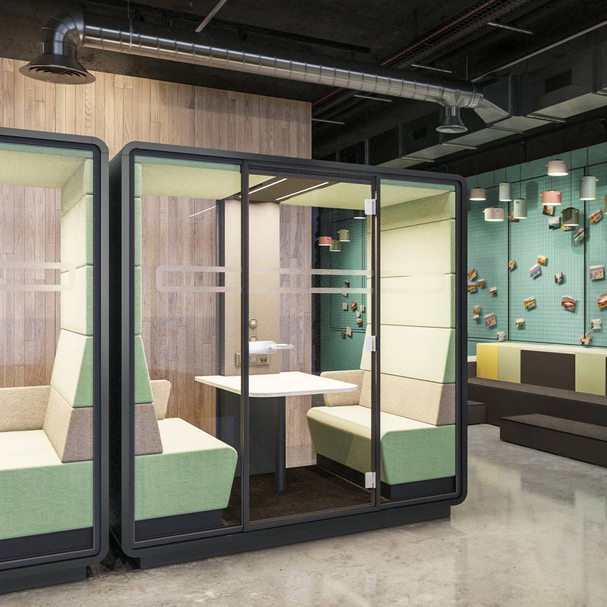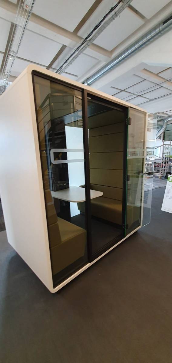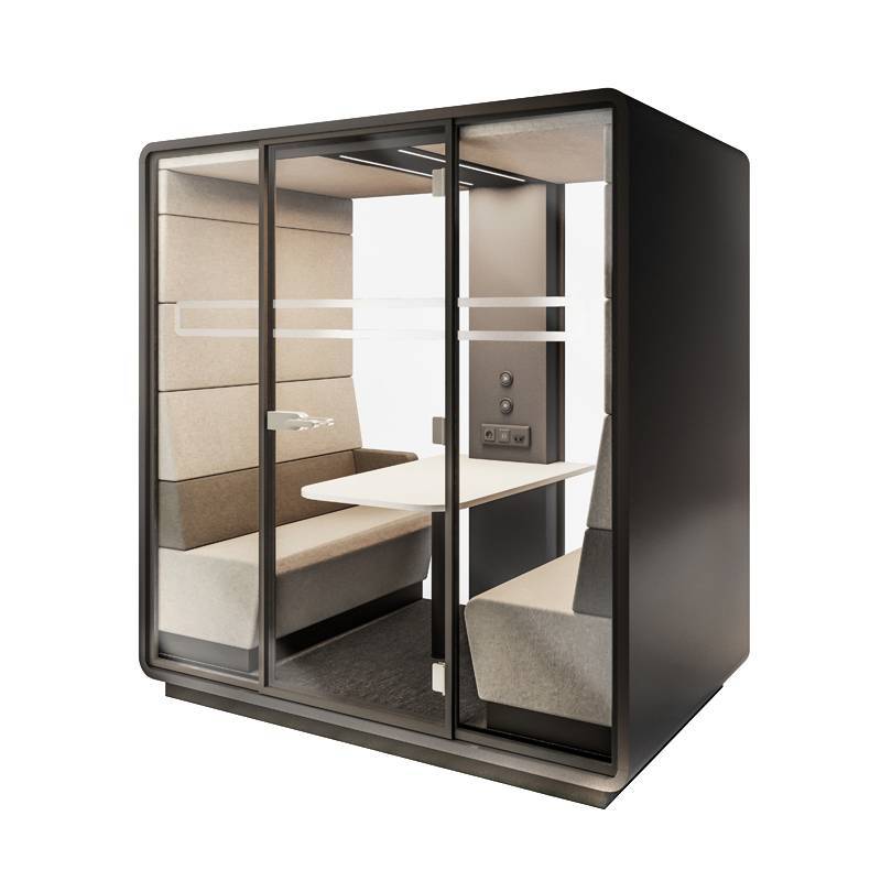 Leur catalogue comprend notamment des cabines de réunion insonorisées, pouvant être placées dans tous les espaces. Idéale pour les opens spaces, cette cabine de 4 places est un confort pour les utilisateurs, leur offrant une pièce équipée pour faire des petites réunions. On retrouve à l'intérieur plusieurs équipements nécessaires, tels que des banquettes et une table, mais aussi des éclairages, des prises électriques ou encore la possibilité de fixer un écran.